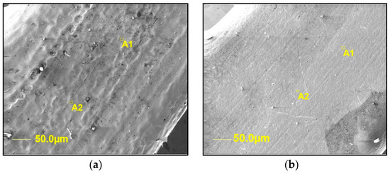 The surface examination with SEM showed significant microstructure differences between the initial and deformed archwires (see Figure 3a,b). The initial archwire surface is rough, with visible holes and other defects, while the deformed archwire surface is smooth and without any other visible defects (inclusions, etc.). This can be attributed to the influence of mechanical loading, which led to the elongation and permanent deformation of the NiTi archwire [36] and the faster release of elements from the surface into the medium.