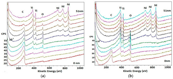 AES depth profiles show the concetrations of elements in the direction from the surface to 51 nm in the depth of each of the archwires: (a) Initial (control), (b) Deformed after the SMAS simulation test.