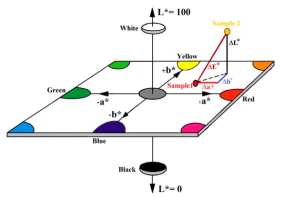 The CIELab comprises the following three coordinates: The coordinate L* represents the degree of colour lightness (ranging from 0 (black) to 100 (white)), while a* and b* are the chromatic coordinates of colour, where the +a* value refers to red and the −a* value to green while the +b* and −b* values refer to yellow and blue, respectively. The total colour change between two specimens was represented as the parameter ∆E* calculated by the following equation: