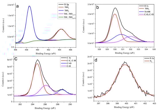 The high-resolution spectrum of O 1s is shown in Figure 7b. The O 1s peak can be deconvoluted into three peaks located at 530.02, 531.59 and 532.75 eV, corresponding to Ti–O (TiO2), Ti–OH and C–O or C=O, respectively [27,31,32,36].
