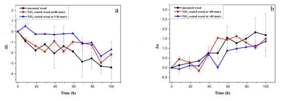 As shown in Figure 8a, the ΔL* value of both uncoated wood and TiO2-coated wood decreased and became negative with increasing irradiation time, indicating that the surfaces of almost all the wood specimens became darker during the UV irradiation process. However, the ΔL* value of the TiO2-coated specimen at deposition velocity (v = 40 mm/s) decreased from 0 to –2 while that of the uncoated wood decreased from 0 to −3.5. The ΔL* value of the TiO2-coated specimen at deposition velocity (v = 80 mm/s) was not much different from that of the uncoated specimen. Generally, the ΔL* value of all TiO2-coated specimens was smaller than that of the untreated specimens.