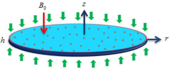 The thin layer flow of a nanofluid over a nonlinear radially extending porous disc in an axially symmetric form has been assumed. The extending disc has been kept at z = 0. The nanofluid thickness is regulated to the thin layer with the breadth z = h where h is the thin layer thickness (Figure 1). The porous disc is stretching with a nonlinear velocity where n is the integer such that n > 0. The applied magnetic field is assumed in a vertical direction to the flow phenomena. The pressure is considered as constant. All others assumptions for the flow phenomena are used as in [24,25,26]. The leading equations are considered as: