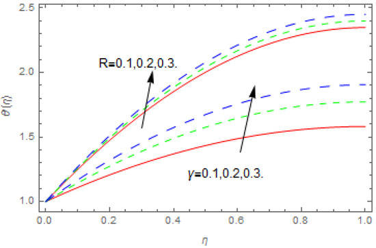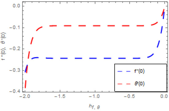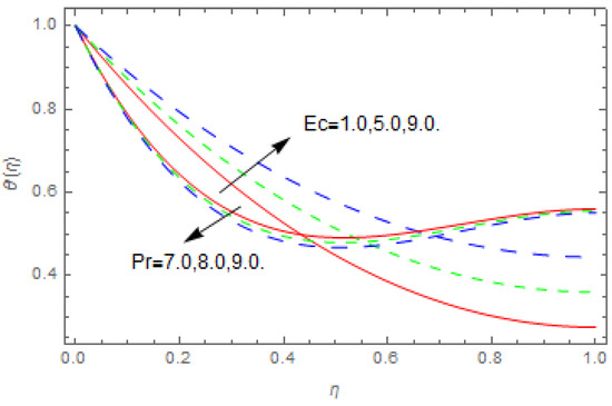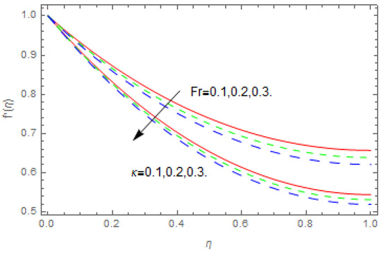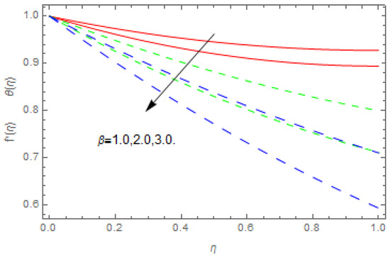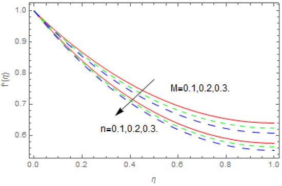 In this section impact of physical parameters on velocity and temperature profiles are discuses. In Figure 2, h-curve for velocity and temperature profiles are displayed. In Figure 3, Figure 4, Figure 5, Figure 6 and Figure 7, the physical influence of the embedded parameters on the thin layer flow of Darcy-Forchheimer nanofluid over a nonlinear radially extending porous disc is presented. Figure 3 depicts the impacts of positive integer and magnetic parameter on . It is determined here that both parameters show a declining behavior in the velocity profile.The nonlinearity stretching phenomena of the thin film flow reduced the thin layer with the escalation in , because the bulky magnitude of produced an opposing force to reduce the fluid motion. Therefore, the fluid velocity was reduced with the escalated n. Moreover, the large amount of M decreased the fluid velocity. Basically, the Lorentz force says that the resists the fluid motion on the liquid boundary which, in result, diminishes the velocity of the fluid. Figure 4 reveals the impacts of κ and Fr on . The porous medium performed a key role during fluid flow occurrences. Significantly, the porosity parameter disturbed the boundary layer flow of liquid which, as a result, produced opposition to the fluid flow and, hereafter, a decline the velocity of the fluid. Furthermore, Fr diminished the fluid flow at the surface of the radially extending disc. This behavior occurred because the porous medium was added to the flow phenomena which decreased the coefficient of inertia, and consequently, the fluid velocity was decreased. The influence of fluid layer thickness β on and is shown in Figure 5. Physically, the resistive force to fluid flow increased with the increase in fluid layer thickness β. The increased fluid layer thickness increased the velocity and a smaller amount of energy was needed for the motion of the fluid. Consequently, the velocity profile was reduced with an increase in fluid layer thickness. Similarly, the increase in fluid layer thickness was reduced . Figure 6 reveals the influences of and R on . Physically, acted like a heat producer which increased the boundary layer thickness and released heat to the fluid flow phenomena. Therefore, the increase in increased . The increase in increased . The upsurge in R enhanced the thermal boundary layer temperature of the fluid flow; consequently, increased behaviour in is observed. The impact of and is revealed in Figure 7. The increased Eckert number increased the temperature of the thin film flow. Actually, the Eckert number produced viscous resistance due to the presence of a dissipation term which increased the nanofluid thermal conductivity to increase the temperature field. The enhanced Prandtl number reduced the temperature of the thin film flow. The higher numbers (e.g.,) possess lower thermal conductivity which result in a decline in temperature of the boundary layer flow. Conversely, the lower numbers possess higher thermal conductivity which consequently increases the temperature of the boundary layer flow.