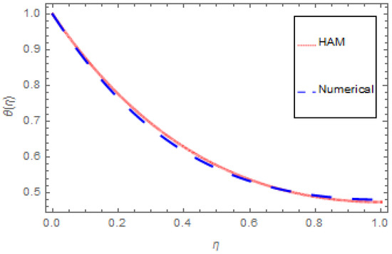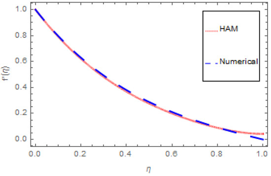 Figure 8 and Figure 9 display a comparison of the homotopy analysis method (HAM) and numerical (ND-Solve) techniques and . The agreement of the HAM and numerical techniques is observed here.