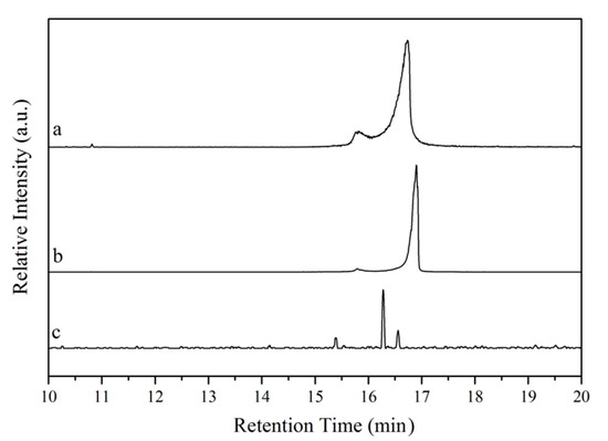Figure 4a,b, respectively), two signals are observed at 15–17 min. The existence of these signals in the chromatogram of tung oil (