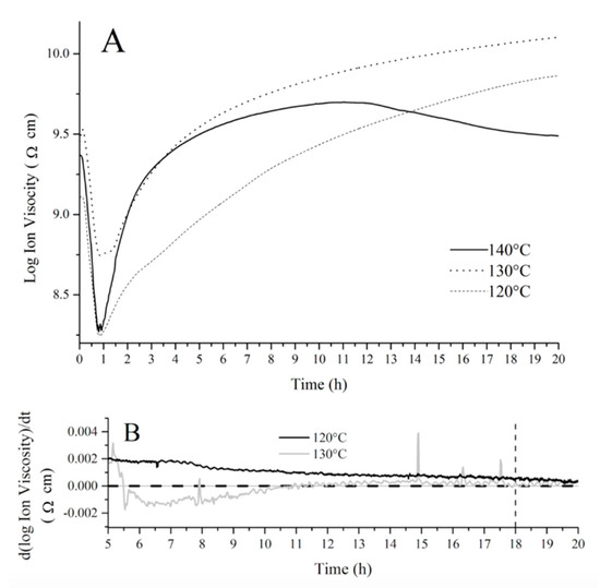 Figure 5A), the ion viscosity continuously increases throughout the duration of the experiment (20 h). In order to obtain a clearer comparison between the cure at 120 and 130 °C, the derivative of ion viscosity with respect to time was plotted against cure time in