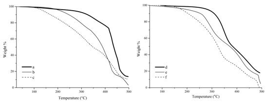 Figure 8a–c) shows a clear trend for their thermal stability. It is indeed obvious that the onset degradation temperature (