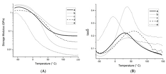 Figure 9d,e), indicating that a stronger reinforcing effect is obtained for the more polar resin, as expected due to its increased affinity with the reinforcement. For the composite prepared with tung oil triglyceride (