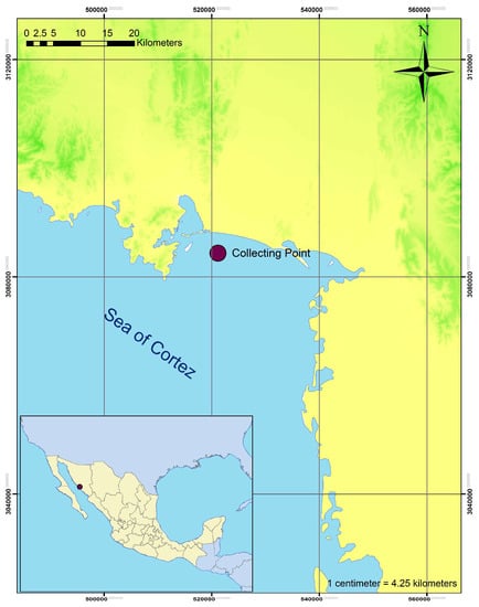 Seawater samples were obtained from the Sea of Cortez, at Cochorit beach near Empalme, Sonora, Mexico at a depth of 4 m and at a distance of 3.76 km from the coast (27° 53’ 1.28′ N, 110° 47’ 5.56′ W) (Figure 1). The samples were collected following the procedure detailed in the field manual for water quality sampling [24]. Five samples were taken throughout the year (spring, summer, autumn and two in winter) and at different times of the day. The physicochemical parameters measured at the time of sampling are shown in Table 1. Three hour after sampling, the collected water was pretreated by 5 μm cartridge filtration and 0.1 µm ultrafiltration (PURIKOR, PKUF-M) with a constant working pressure of 0.2 MPa and a permeate flow rate of 3.7 L min−1, as a representative analogue of the pretreatment that takes place in typical large-scale desalination plants [25].