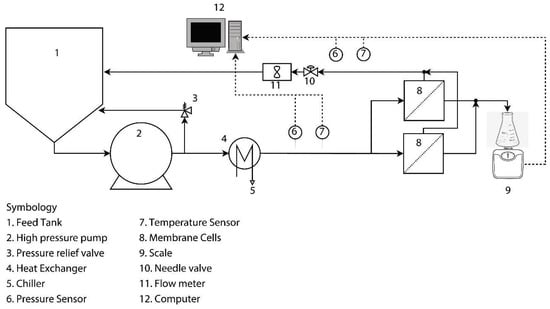 The bacterial growth on the RO membrane surface took place in CF042 crossflow membrane cells (Sterlitech Corp., Kent, WA, USA) (Figure 2). The feed water comprised sterile pretreated seawater and a high amount (109 CFU mL−1) of the studied strain. In addition, a sterile nutrient broth was added daily to the feed water, to guarantee optimal bacterial growth. The operating pressure was 6.38 MPa during the test, which ran for 90 h at an average temperature of 30 °C, while the pH remained in a range of 6–8. A low crossflow velocity of 0.15 m s−1 was used in order to minimize shear stress and encourage a high biofouling rate. After the accelerated biofouling test, biofouled membranes were analyzed by scraping 1 cm2 of biofilm. Then, the optical density of the scraped biofilm was determined by spectrophotometry, the biofilm cake layer was measured using inverted microscopy, and a Neubauer chamber using an optical microscope in 100× was used to carry out the total cell count in the biofilm. The amount of organic matter was determined by the catalytic combustion method [10].
