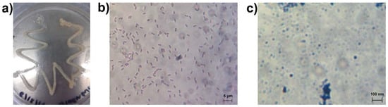 After 24 h of incubation, only one bacterial isolate (MCC1) grew for each repetition in direct pretreated seawater. No growth of CFUs was observed for the 10−3, 10−2, 10−1 dilutions. This bacterial strain showed medium size colonies (5.0 ± 1.0 mm), convex, whitish such as wax, rounded edges, fusiform and circular shape (Figure 3a). In addition, the Gram stain showed a Gram positive cell with a size of 2.8 ± 0.2 μm (Figure 3b), and spore size of 18.0 ± 0.0 nm (Figure 3c). As the ultrafiltration membrane nominal pore size of 0.1 μm is smaller than the typical sizes of bacteria, this indicates that only spores could pass through the filter and grow on the Petri dishes, thus originating the CFU found [35]. The ultrafiltration membrane did not show integrity problems during the lapse of the testing.