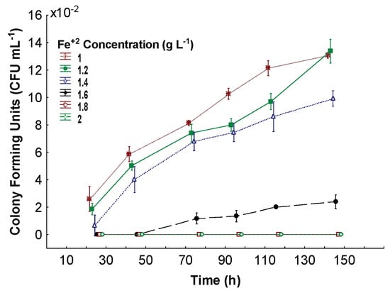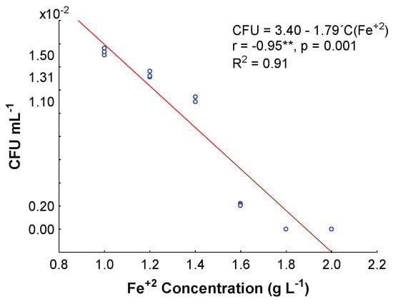 A significant decrease in the final bacterial population for the strain MCC1 was observed with increasing Fe+2 concentration. There was a negative correlation with a highly significant (95% confidence) dependence between these variables (r = 0.95, p < 0.001). The degree of goodness of fit was high (R2 = 0.91) for a linear regression model (Figure 5). The greatest decrease in CFUs for MCC1 was observed when the Fe+2 concentration was increased from 1.4 to 1.6 g L−1, presenting 50% of the total inhibition by Fe+2. At Fe+2 concentrations of 1.8 g L−1 and higher, no bacterial growth was observed. Despite the previously mentioned capability of Bacillus halotolerans MCC1 to adapt to extreme conditions, there is a clear adaptability limit after which it cannot survive. Therefore, the minimum inhibitory Fe+2 concentration was 1.8 g L−1, as the data suggests that this bacterium cannot grow at higher concentrations. At concentrations above that level, the accumulation of Fe+2 can stop cell growth or cause death due to DNA damage [40].