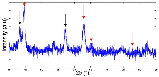 XRD of the FeNPs showing the peaks associated with the Fe (red arrows) and iron oxides (black arrows) present on the FeNPs.