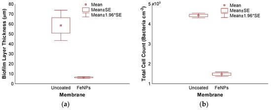 The FeNP coating reduced the biofilm thickness by 90% (Figure 9a), and the bacterial density on the membrane showed a highly significant reduction of 67% compared to the uncoated membrane, which can be attributed to the FeNPs (see Figure 9b). The optical density also showed a highly significant reduction related to the FeNP coating, as it was 42% lower than for the uncoated membrane (Figure 9c). In addition, the organic matter content in the biofilm was lower (about 92%) for the FeNP-coated membrane compared to the uncoated membrane (Figure 9d). All these results can be related to the Bacillus halotolerans MCC1 being unable to produce iron-chelating metabolites (siderophores), which limits its ability to tolerate and grow under high Fe concentration [45]. Therefore, the direct exposure of this strain to the FeNPs located on the membrane affects its reproduction and growth rates. This can also be associated with the oxidative stress that has been shown to be caused by the generation of ROS by FeNPs, leading to damage of cellular DNA, lipids and proteins, causing bacterial death [46,47]. The existence of this latter mechanism also suggests that the Fenton reaction facilitated by the FeNPs can cause the death of different bacteria, not only of Bacillus halotolerans MCC1 [19,46], since the FeNPs in the presence of dissolved oxygen and water form hydrogen peroxide and Fe+2 ions. The hydrogen peroxide and Fe+2 then, in turn, initiate the Fenton reaction cycle, which produces several ROSs with strong biocidal effects. However, in this reaction the FeNPs also are oxidized to Fe+2, which eventually limits the FeNPs’ effectiveness as a biocide due to the leaching of Fe+2 ions [48]. Nevertheless, the FeNPs can still hinder biofilm growth and decrease biofouling problems in desalinations plants.
