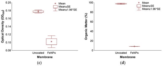 Effect of FeNP coating on biofilm parameters obtained after biofouling of RO membranes by Bacillus halotolerans MCC1: (a) thickness of biofilm layer formed onto the membranes; (b) bacterial count obtained from scraped biofilm; (c) optical density of scraped biofilm; (d) organic matter in scraped biofilm.