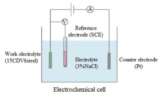 Electrochemical evaluation of coatings was carried out by electrochemical impedance spectroscopy (EIS) using a Potentiostat (SP-200, BioLogic, Knoxville, TN, USA) instrument. A three-electrode system was used for the electrochemical test used in this study as is shown in Figure 2. A saline solution with a 3 wt % NaCl concentration was used as a corrosive electrolyte. All electrochemical measurements were performed after 1 h immersion time.