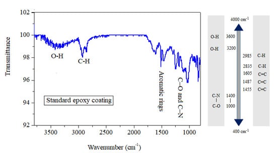 The Fourier Transform Infra-Red spectroscopy (FT-IR, FTS 6000, Digilab, Randolph, MA, USA) spectrum of polymeric epoxy cured with polyaminoamide on the 15CDV6 steel surface is shown in Figure 3.