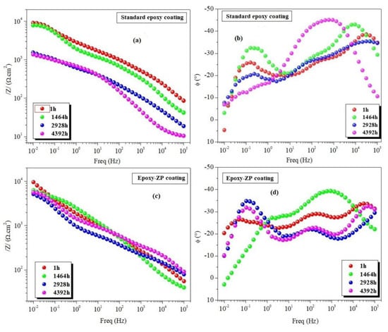 The impedance modulus at 0.01 Hz was high, greater than 8 kΩ·cm2. As can be seen from Figure 3, the total impedance of the epoxy coating in the high frequency region (9 × 103 kHz) after 1 h of immersion is slightly greater than that of the standard epoxy coating. The|Z|0.01 Hz values of the standard epoxy coating started at 8.90 kΩ·cm2 after 1 h immersion and dropped to 1.40 kΩ·cm2 after 4392 h of exposure. The decrease in the impedance values with immersion time could be related to the dispersion of the corrosive electrolyte into the polymer coating, thus the barrier properties of the film are reduced. Further, the impedance for the epoxy-ZP coating is significantly higher than that for the standard epoxy coating, after 1 h of exposure it was 9.50 kΩ·cm2 and then dropped to 5.90 kΩ·cm2 after 4392 h of exposure. This shows the good barrier properties of epoxy-ZP coating, which could be attributed to the presence of the pigments as well as the epoxy resin. The pigments fill the micro holes and cuts in the epoxy coating, as a result of that the epoxy resin porosity diminishes [24,25,26].