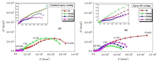 The Nyquist plots of standard epoxy coating and epoxy-ZP coating after 1464, 2928, and 4392 h exposure are shown in Figure 5.