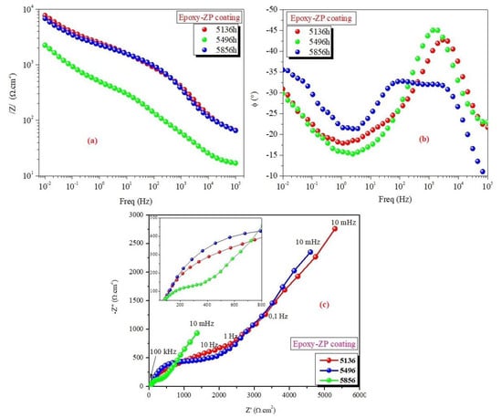 The Bode (magnitude and phase) and Nyquist plots for the epoxy-ZP coating after exposure for different times are shown in Figure 7a–c.