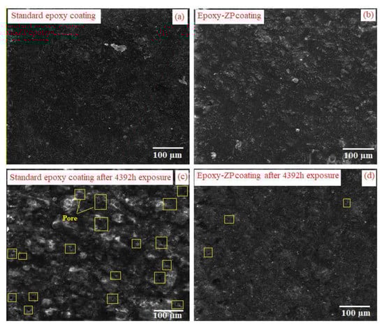 Scanning electron microscopy analysis was performed to investigate the surface morphology of the two evaluated polymer coatings: Standard epoxy coating and the epoxy-ZP coating. The coating surface exposed to an electrolyte solution in a spray test chamber was also evaluated at various times of exposure. Results are shown in Figure 9 and Figure 10.