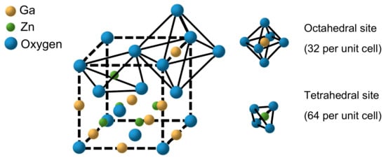 Zinc gallate (ZnGa2O4) is a wide-band gap semiconductor oxide with a cubic spinel structure (Fd3m, a = b = c = 0.8335 nm, and α = β = γ = 90°). The Ga3+ ion occupies the octahedral sites, and the Zn2+ ions occupy the tetrahedral sites, as schematically illustrated in Figure 1. ZnGa2O4 possesses an energy bandgap of approximately 5 eV and a conductivity of 30 Scm−1 [1]. Owing to its high transparency in the ultraviolet (UV) wavelength region, non-corrosive-gas emission under electron bombardment, and stability in high vacuum, ZnGa2O4 has been reported to be favorable for several optoelectronics applications in recent years, such as low-voltage vacuum fluorescent displays, field emission displays and UV photodetectors [2,3]. Moreover, UV light induces transitions of self-activated optical centers in the normal spinel structure of ZnGa2O4, giving rise to an intense blue luminescence. When doped with Mn and Cr, the emission spectrum of ZnGa2O4 ranges from green to red [4,5]. Thus, ZnGa2O4 phosphor has been investigated for its unique and good luminescence characteristics.