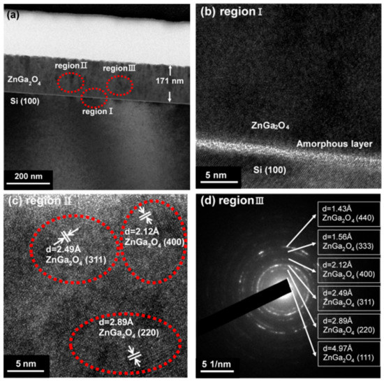 For comparison, TEM images of the ZnGa2O4 film deposited on Si(100) are shown in Figure 5. The ZnGa2O4 film was noticeably thicker on Si(100) than on sapphire (Figure 5a), because the growth rate of ZnGa2O4 film deposition on amorphous layer is enhanced by amorphous layer with loose structure [23]. HRTEM images of the ZnGa2O4 film on Si(100) were acquired in the regions marked I and II in Figure 5a and are displayed in Figure 5b,c, respectively. In Figure 5b, the film-substrate interface (region I) appears as an amorphous layer with an approximate thickness of 2 nm. The native surface-oxide was removed from the Si(100) substrate before the deposition process. The newly produced amorphous silicon oxide layer might be attributable to deposition of the ZnGa2O4 film under the oxygen working pressure of 9 × 10−3 torr [24]. Such an amorphous layer can interfere with the oriented growth, causing randomly oriented poly-crystallites in the ZnGa2O4 film. Multiple d-spacing values (2.49, 2.19 and 2.76 Å) were found in region I of this film (Figure 5c). Based on the ringed SAED patterns in region II (Figure 5d), the polycrystalline ZnGa2O4 phase was indexed to the orientation of (311), (400) and (220) planes, in good agreement with the XRD result.