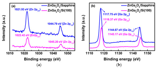 Binding energies of Zn 2p3/2, Zn 2p1/2, Ga 2p3/2, and Ga 2p1/2 in ZnGa2O4 thin films deposited on sapphire and Si(100).