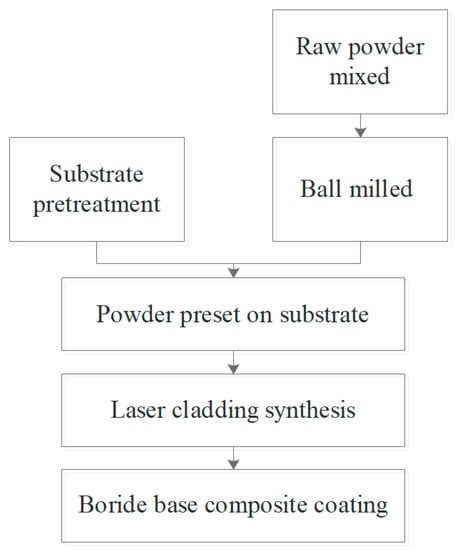 Before the laser cladding process, Q235 substrates were sandblasted for 10 min to remove rust oil, then they were cleaned with alcohol. Mo, Ni60, Cr, and B powders were mixed and ball milled for 2 h. During the laser cladding process, a Laserline 4000–100 laser was used for the laser source, and the wavelength of the laser was 1080 nm with a laser spot diameter of 5 mm. Two different powder pretreatment methods, including polyvinyl butyral (PVB) binder presetting and squash presetting, and two different aftertreatment methods, including remelting and no remelting, were used to investigate their influences on M3B2-based cermet coatings in this experiment. Detailed laser cladding parameters are given in Table 2, and the production process of M3B2-based cermet coatings is exhibited in Figure 1. After preparation, the coated specimens were cut into small specimens of 10 mm × 10 mm for further characterization.