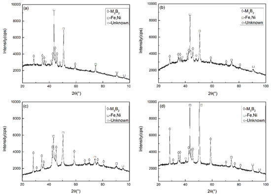 The XRD patterns of M3B2-based cermet coatings are shown in Figure 2. Results indicate that all samples consisted of the (M2M)3B2 (M: Mo, Ni, Cr, Fe) complex boride phase and the {Fe, Ni} phase. The boride phase, M3B2, was synthesized by laser cladding.