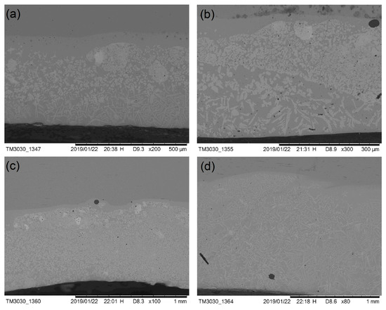 Microstructures of the samples are shown in Figure 3. White, light gray, and dark gray colored phases were found in all samples. The dark gray phase is the substrate Q235 steel. The other two phases were found in the coating, which was consistent with the XRD results. The cross-section in the coating, shown in Figure 3, took on a visible structure of stratification, with a large amount of the light-gray phase but less of the white phase in the top layer of the coating, more white phase and less light-gray phase in the middle layer of the coating, and more light-gray phase in the bottom layer of the coating. The white phase was dendritic in the top layer, and it was flocculent in the middle layer, shown in Figure 3a, which used a PVB binder presetting method. The flocculent white phase in the middle of the coating diffused to the surface and the binder interface, and the thickness became thicker after being remelted, as shown in Figure 3b. The thickness of the coating was much thicker when the squash presetting method was used, according to previous experiments which used the PVB binder presetting method with a maximum coating thickness of 0.8 mm. The stratification shown in Figure 3c,d is not obvious, as it is also shown in Figure 3a,b. The top and bottom layers were smaller than those present in coatings using the PVB binder presetting method. The microstructure of the coating using the squash presetting method was very uniform and fine. The white structure of the coating changed from square- to needle-shaped after it was remelted, the thickness increased, and the structure became very uniform.