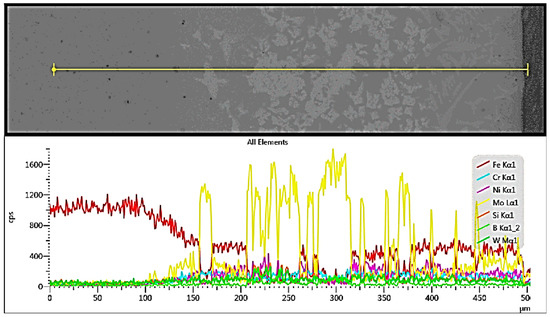 The elemental map in Figure 5 shows the spatial distribution of elements in the coating by SEM with EDS. The elemental distribution of the white phase was composed of a large amount of Mo and less Fe, Ni, and B, whereas the light-gray phase contained large amounts of Fe and Ni. It is considered that the white phase was M3B2 and the light-gray phase was the {Fe, Ni} phase, which agrees with the XRD analysis.