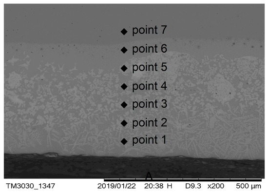 The micro Vickers hardness test point positions of the boride-based composite coatings are shown in Figure 6. Seven points were tested on the cross-section, and three group points of each sample were tested.
