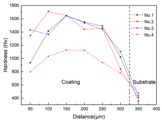 The average hardness data of three groups are shown in Figure 7. The results show that the trend of cross-section hardness in the four samples was identical. The hardness increased from the top layer of the coating to the middle layer of the coating, then it decreased towards the substrate. The presetting method and process parameters influenced hardness, although the same variation trend regarding hardness was observed in all samples. The mean hardness of Sample 1 was 1343 HV, and the maximum value reached was 1647 HV (in the middle layer). The mean hardness of Sample 3 was 1421 HV, and the maximum value reached 1647 HV in the middle layer. The squash method resulted in a harder coating compared to the PVB binder method. Remelting process technology was used in Samples 2 and 4. The hardness curves show that the hardness of Sample 2 was higher than that of Sample 1, whereas the hardness of Sample 4 was lower than that of Sample 3, indicating that the remelting process had a large effect on the hardness.