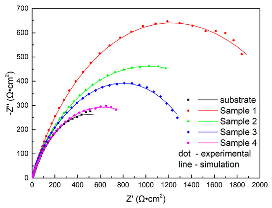 The EIS analyses of the substrate and the coatings of all samples are shown in Figure 8 and Figure 9. It can be seen that the Nyquist plots of samples formed a single capacitive reactance arc. The diameter of the capacitive reactance arc reflects the rate of the electrochemical reaction [27]. As the Nyquist plots in Figure 8 show, the diameter of the arc increased from substrate to the coating of Sample 1. This indicates that the corrosion resistance was improved by the coating, and the diameter arc was at its maximum when the PVB binder presetting was used without remelting.