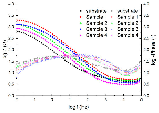 The frequency-phase Bode plots of all samples are shown in Figure 9. They exhibited the same features as the Nyquist plots. The Z value was lowest for the substrate and highest in Sample 1 at the lowest frequency, which indicates that Sample 1 had the best corrosion resistance.