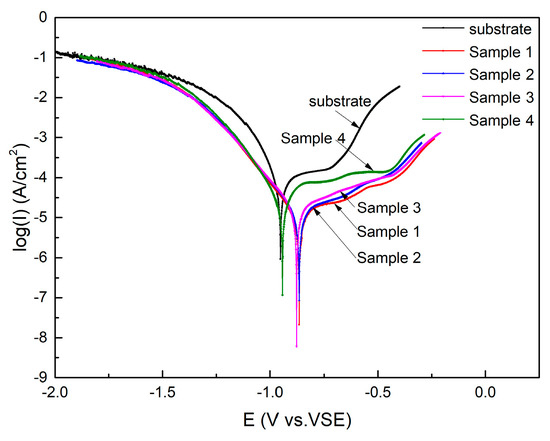 The polarization curves of the substrate and coating samples immersed in experimental solutions are shown in Figure 11. It clearly shows that the activated state shifted to a passivated state in the substrate and all samples. A stable passivation film formed on the surfaces of the substrate and coatings. The transition-passivated state of the substrate and Sample 4 are more clearly shown in Figure 11. It shifted from a passivated state to an over-passivated state quickly, and the passivation film located on the substrate surface dissolved. The coatings’ passivated curve interval increased similarly to that of the substrate. The passivation film was quickly formed on Sample 1–3, and the time it took for the film to dissolve was much longer in all samples compared to the substrate. The polarization curve shifted to the right, which indicates that the corrosion rate decreased. The corrosion potential of the substrate was the lowest, and that of Sample 1 was the highest in Figure 11. The curves show that the coatings had good corrosion resistance, and Sample 1 had the best corrosion resistance.