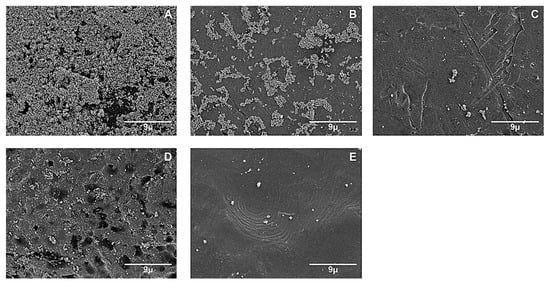 Representative micrographs from the SEM of orthodontic brackets with silver nanoparticles via the method proposed in [33] (2500× magnification): (A) GI, (B) GII, (C) GIII, (D) GIV, (E) GV. For bracket names, please refer to Section 2.1.