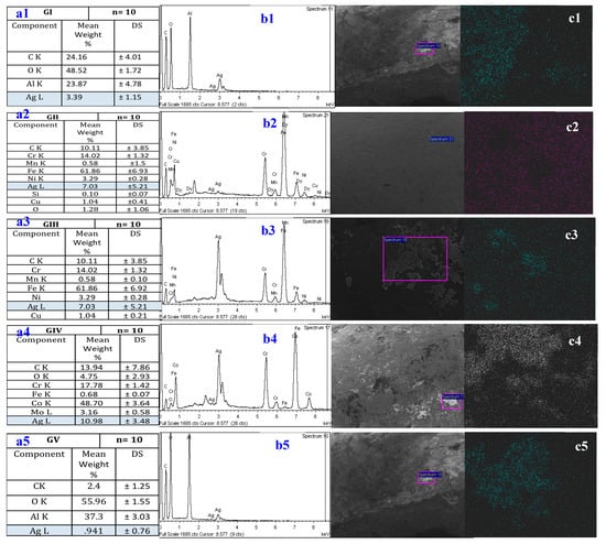 (a1–a5) Mean and standard deviation by group: GI, GII, GIII, GIV and GV; (b1–b5) representative spectrum from the chemical composition of the silver nanoparticles obtained by energy-dispersive spectroscopy (EDS); (c1–c5) mapping analysis based on SEM of the silver nanoparticles on the brackets synthesized via the method proposed in [33].