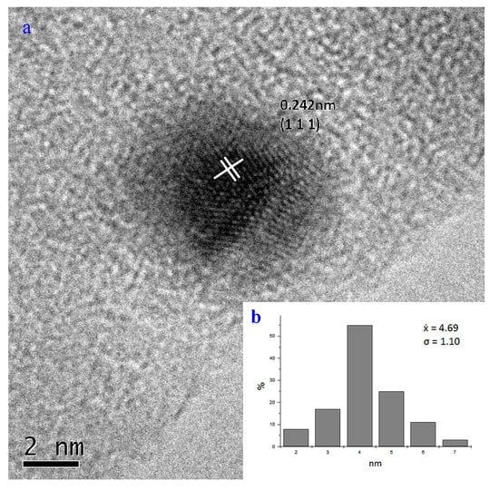 (a) High-resolution TEM (HRTEM) micrograph, where it can be observed that the synthesized silver nanoparticles (AgNPs) obtained a spherical shape with an interplanar distance of 0.242 nm, corresponding to plane (111). (b) The frequency histogram reports that the average size reached was 4.69 nm with a standard deviation of ±1.10.
