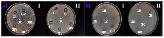 (a) Representative images of brackets without AgNPs (control group) and (b) brackets with AgNPs (experimental group) when evaluated in vitro with strains of Staphylococcus aureus (I) and Escherichia coli (II).
