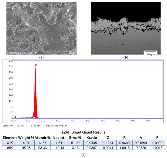 The surface characteristic of plasma-sprayed Al (a) surface and (b) subsurface; (c) The surface characteristics of energy dispersive X-ray spectroscopy (EDX).