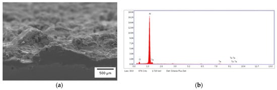Ta (400 μm)/Al (100 μm)/SS test piece: Shows the cross-section characteristics of the plasma-sprayed Ta–Al–SS test piece, whereby it can be found that each interface is completely attached, and, with the help of SEM/EDX, it was confirmed that the top layer of the Ta film is 100% pure metal. (a) Subsurface interface characteristics, (b,c) EDX analysis of Ta layer.