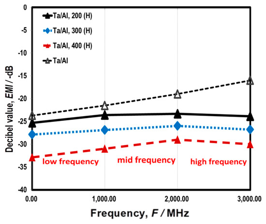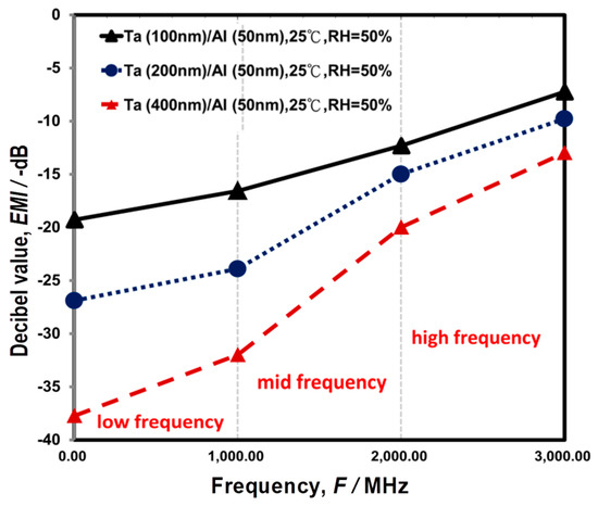 For the Ta–Al–glass system, the EMI shielding was significantly promoted when the thickness of the Ta film was increased from 100 and 200 to 400 nm (Figure 6). In other words, increasing the Ta film thickness not only increased the index of crystallinity (IOC) and the low resistivity (Table 1), but also enhanced the electromagnetic shielding effect. Otherwise, according to the data of 200 and 400 nm, it was found that there was linear relationship between EMI shielding at low and middle frequencies.