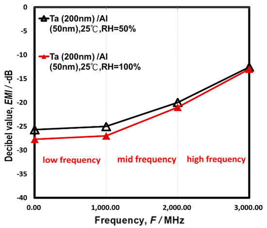 EMI shielding of Ta/Al/glass test sample with different humidities.
