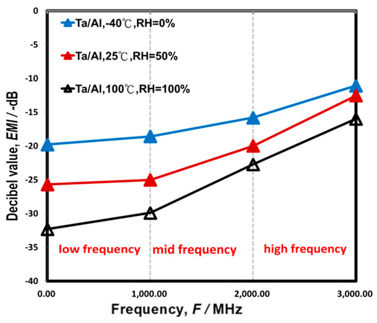 In addition, the interface effect was caused by the porosity increasing or the formation of interface microcracks when Ta film thickness was increased. This resulted in the inability of the electromagnetic shielding efficacy to be improved at high frequency; and increasing temperature and humidity had obvious benefits on electromagnetic shielding. Therefore, in terms of overall performance, the Ta (200 nm)/Al (50 nm)/glass structure not only improved the conductivity (Table 1), but also enhanced the low-middle-frequency EMI shielding.
