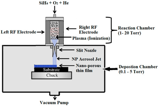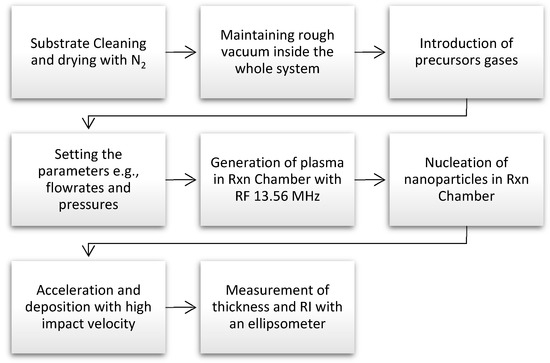 In this research work, borosilicate glass and silicon wafer substrates were used as substrates to deposit silica nanoparticle coatings. The deposition process commenced with cleaning of exposed surfaces of both of the substrates. At first the substrates were sonicated for 10 min in the presence of acetone followed by rinsing with deionized water. The cleaned substrates were dried by blowing nitrogen gas over all of the exposed surfaces at moderate pressure. Afterwards, the individual substrates were placed inside the indigenously developed aerosol spray assembly for the deposition of coating. The assembly comprises synthesis and deposition chambers separated by a variable nozzle aimed at expanding the precursor gases supersonically over the substrate, as demonstrated in Figure 1. The reaction chamber encompasses two rectangular electrodes of 15 cm height and 7 cm width, placed parallel to each other at 1.5 cm apart, supplied with 0.98 W cm−2 RF power at a frequency of 13.56 MHz to generate plasma. The basic design of the reaction chamber is described elsewhere [37]. The 5% SiH4 precursor was mixed with oxygen and helium at control flow rates of 160, 500, and 400 sccm, respectively, in the reaction chamber, where they were turned to silica nano-particles by the plasma. The reaction chamber pressure was maintained at 2–2.5 Torr. The newly formed nanoparticles were plunged through the 0.5-mm slit nozzle towards the substrate in the deposition chamber, which was maintained at a pressure of 0.2 Torr. The pressure ratio between the two chambers aids in controlling the density and porosity of the thin film on the substrate. Depending on the desired film thickness and refractive index, the substrate holder is moved back and forth several times at 10 cm s−1. In this research work, the target was single layer coating of silicon dioxide nanoparticles with a refractive index, porosity, and thickness of 1.23, 50%, and 120 nm, respectively. Two sets of thin films were deposited on glass and silicon wafer substrates in the same condition for ease of characterization. The glass substrate film was subjected to UV-Vis-NIR transmission spectroscopy along with electrical performance assessment, whereas ellipsometry, electron microscopy, and FTIR analysis were performed on the silicon wafer. All the experimental steps are shown in Figure 2.