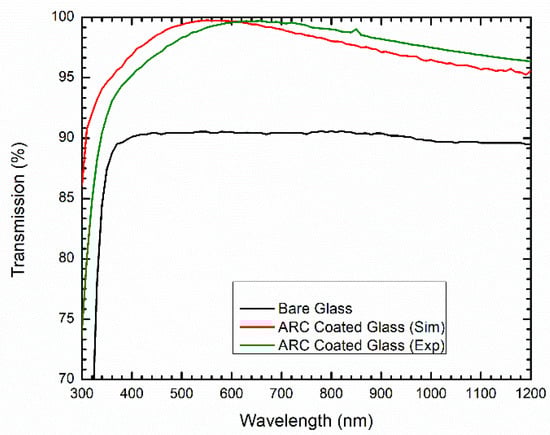 Figure 3 presents the simulation and experimental transmittance results of the uncoated and coated glass slides (black for uncoated sample, green and red for coated sample) in the wide range of 300–1200 nm. An average transmittance of 90.1% was observed for the bare glass. The average transmittance after silica coating deposition was more than 97% for normal incidental light. The average increase in the transmittance in the 300–1200 nm range of the spectrum was found to be 6.3% when measured in the laboratory, while an increase of 6.9% was found in simulation. A peak transmittance of 99.8% was recorded at 550 nm for a simulated refractive index of 1.23 and thickness of 120 nm, although the peak is lower at higher wavelengths. On the other hand, in experimental results, a peak value of 99.6% was achieved at 600 nm. As can be witnessed from the curves, the experimentally measured transmittance in some areas is lower than the simulated curve. This may be due to the slightly higher refractive index and thickness of the developed coatings in the laboratory than the design values. In addition, a slight increase of absorption edge in the blue band in the coated curve may be due to the very small size of silica nanoparticles, as mentioned by Rahman et al. in their work [40].
