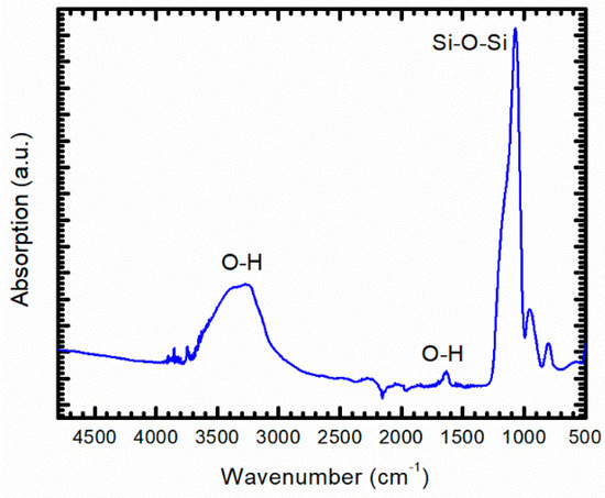 For assessment of the absorption in the IR region, and to find out which functional groups are attached on the surface of the coatings, FTIR was performed as shown in Figure 4. Results of FTIR curve show an appreciable absorption band at 1080 cm−1 owing to the stretching modes of the Si–O–Si group. Another strong band at 790 cm−1 corresponds with the bending vibration of Si–(CH3)3. The broad band at 3700–3200 cm−1 and the small peak at 1650 cm−1 points to the stretched band of hydroxyl group Si–OH on the surfaces of silica nanoparticles. It has already been established that the wettability of the surface depends upon the chemistry of the surface [21]. The presence of the OH group at the surface quickly attracts and spreads the water droplets due to hydrogen bonding, and thus becomes a thin film. Due to the spreading of the water droplet, the dirt or contamination on the surface is also removed with the water, thus removing the dust from the surface. The strong OH group also indicates that the majority of Si atoms are present at the surface. During the deposition process, these surface groups react with each other to produce Si–O–Si bonds via condensation [35]. Thus, FTIR confirms the presence and stretching of the hydroxyl group and the concomitant of hydrogen bonding, ultimately creating superhydrophilic behavior.