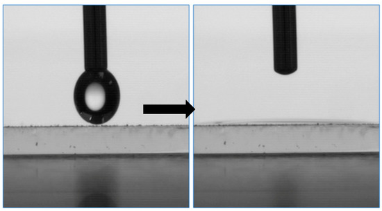 Water contact angle is a parameter used to determine the extent of wettability of a surface. Surperhydrophobic surfaces with a large water contact angle (WCA) usually greater than 150° and low rolling angle hysteresis may be used to allow water droplets to roll off the surface, cleaning the dust or soil contaminants [24,25]. Similarly, a superhydrophilic surface with a contact angle below 10° spreads the falling water droplet on its surface, cleaning the dust or soil particles from it. As shown in the Figure 6, the WCA value for the substrate decreased from 55° to 2° when a silica nanoparticle coating was introduced on the glass substrate. This shows that the surface becomes superhydrophilic, which can be used as a self-cleaning surface for a variety of applications. The presence of a hydroxyl group (OH) can be a possible explanation for the development of superhydrophilic properties in the silica nanoparticle coatings, as discussed in the FTIR analysis of the research work above [24]. Moreover, surface roughness has also been found to induce superhydrophilic behavior, as per Wenzel’s theory given in Equation (6):